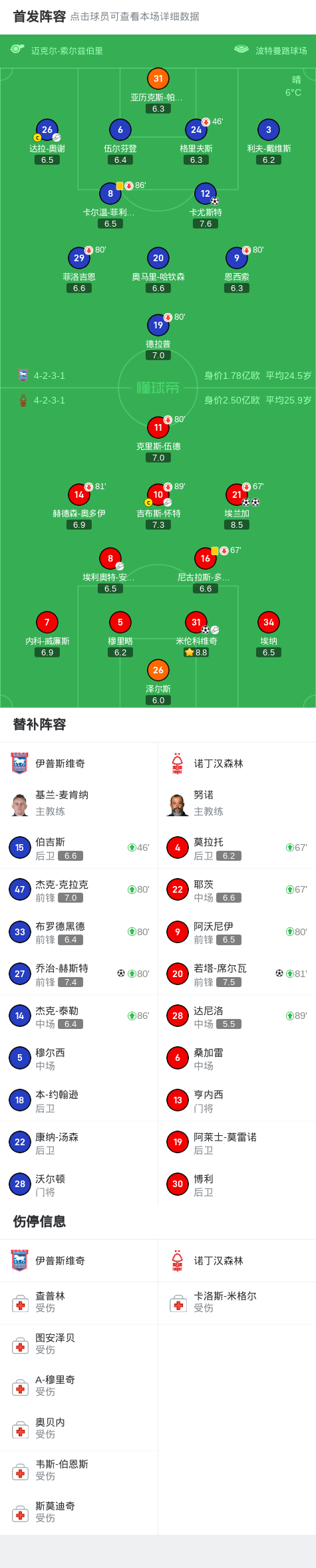 本场比赛中,米伦科维奇和埃兰加的出色表现让人印象深刻。米伦科维奇凭借精准的射术率先为球队取得领先,而埃兰加则连进两球,展现了出色的个人能力和进球效率。而在伊普斯维奇方面,卡尤斯特和乔治-赫斯特的进球也展现了球队在进攻端的一定威胁性,但仍然难以撼动诺丁汉森林的防线。